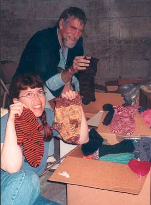 Volunteers Paula Bagby and Stan Stanbury sorting and packing hand-knit socks bound for Central Asia.