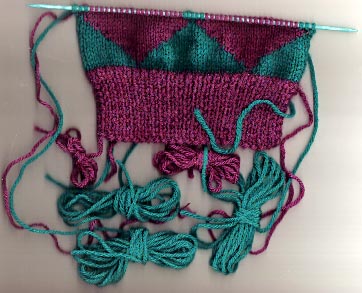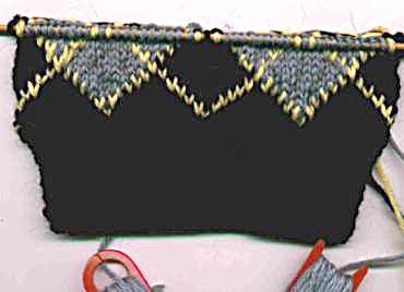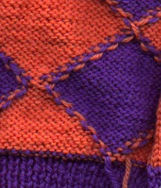1" in st st. Row gauge is not critical. Row 1 (WS): P1, *k1, p1; rep from * across. Row 2: K1, *p1, k1; rep from * across. Rep Rows 1 and 2 for 2", ending by working a wrong side row. For simplicity’s sake, this design only calls for two different colors in the upcoming rows. Traditional argyles are usually made with two or more contrasting colors for the diamonds, and two or more colors for the diagonal lines. You may want to use more colors-feel free! Some folks prefer to knit their lines in with the diamonds. If that’s your preference, skip to Graph B and follow that. I prefer to duplicate stitch my lines in later, and I think this is easier for knitters with no intarsia experience. If you want to add the lines later, use Graph A. Change to stockinette stitch and begin working Graph A (or Graph B). Knit the odd-numbered right side rows from right to left, and purl the even-numbered wrong side rows from left to right. A few notes about intarsia: In the introduction, you will have read my opinionated idea about using bobbins. Namely, don’t.*** Instead, use a separate length of yarn for each block of color you will need, i.e., for the first row of Graph A, you will need two lengths of MC and three lengths of A. How long a length, you ask? My personal preference is to use about two "reaches"-the length from my nose to my hand with an outstretched arm. Some knitters prefer to make yarn butterflies by winding a length of yarn in a Figure-8 shape around their fingers, then securing one end by wrapping 2-3 times round the center of the "8". The other end should easily pull from the center of your new, tiny skein. ***If you are a committed bobbin user and really enjoy working intarsia with bobbins, be my guest. Remember, there is no wrong way to knit! When starting a new yarn, don’t worry if you have a hole. Just start using the new strand, leaving a 4-6" tail to weave in later. If you leave a 6" or longer tail, you will have some left to work with later in case you need to duplicate stitch over any mistakes you make in the pattern. (Voice Of Experience speaking.) Some people like to weave in their ends as they go; use your own judgment. On intarsia, I usually prefer to do the ends last-I feel more in control of those sometimes naughty corner stitches. In addition, I will use some MC ends to sew seams later. When changing colors, it is important to twist the colors to avoid a hole at the color change. I’ll try to describe this as it looks when changing from your main color (MC) to your contrasting color (A): Knit or purl last stitch in MC, drop MC down and toward the left. Bring color A around to the right and up from behind/under MC before knitting or purling the next stitch. You may need to give a gentle tug on each yarn to "set" the stitches and even them up. On Row 36, knit 12 sts, then put these on a holder or ribbon. Call this Holder #1. Knit the 25 sts from the graph, and put the remaining 12 sts on a holder or ribbon. Call this Holder #2. The 24 sts now on Holders #1 and 2 will become your heel flap in Lesson Two. Beginning with a purl row, continue working graph on 25 sts through Row 61. Put these stitches on a holder, call it Holder #3, and break off MC, leaving a tail for later seam sewing. End of Lesson One. Take a deep breath. This lesson was probably the longest and wordiest of any of them. Click on any of the photos below to see a larger image. Use your browsers back button to return to this page. This is a great photo from Edie showing us how the