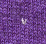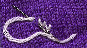 We are interested in the V’s as they appear when the sock is held as it has been as you worked on it so far-with the cast-on edge pointed towards the floor. Don’t get confused and start working with the V’s going the other way. To duplicate stitch, thread a length of yarn (color B) through your tapestry needle. Referring to the graph, find the stitch that you want to cover. For our purposes, call this the "base" stitch. It will be a V. Bring your needle from the back of the fabric up through the base of this V and pull the yarn through, leaving a 4-6" tail hanging in the back. Now look at the path the yarn of the base stitch takes. It goes around through the base of the V above it and back out the other side. **** Insert your tapestry needle so that it follows the path of the base stitch yarn-down into the fabric on one side of the V above your stitch, and out back the other side of that V, but instead of going "down" and "up", do it in one motion as you do when you are sewing.