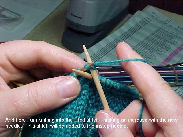 This series of photos (with Sande's explanation) shows how and where to pick up the extra stitch on the left side of the sock to eliminate the hole that often forms in the corner of the gusset.