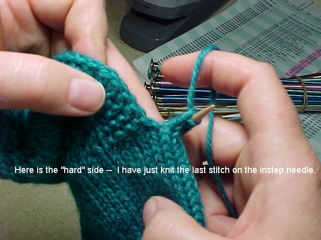 ELUSIVE GUSSET STITCHESThis series of photos was taken by Sande's co-worker Pat Brown, of Sande knitting at work shows us how to pick up stitches on the edge of a heel flap