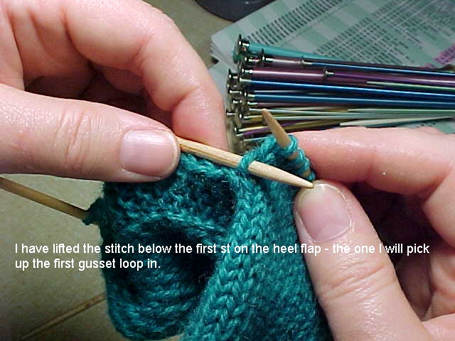 the needle to pick up a stitch. Put the needle through the back loop on the edge of the heel flap only. The right side of your work will be facing you.