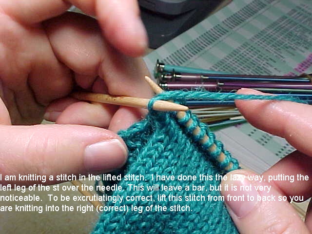 to start the gusset.In Sande's own words, "I get this lovely open chain selvage by using a garter st border on my heel flap and slipping the first st on each row with yarn in front. If you don't K the first and last st of every row the steps to get a chain selvage are a bit different. I think that on stockinet you can just slip the first st on both K and P rows and get the same effect. I have never found picking up in the bumps to be much fun, so now I only do it the easy way.