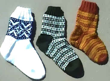 I like to make samples before I begin, not only to get an idea of the proper gauge, but also to see how the colors look together and how well the pattern shows up. Contrary to the general wisdom which says that if you're planning a circular object you need to knit a circular swatch, I start out with a flat swatch for socks. I'm willing to go ahead with a general idea of the gauge, and let the leg of the first sock serve as a circular swatch--after all, how much work have you committed to this thing by the time it's a couple of inches long?