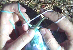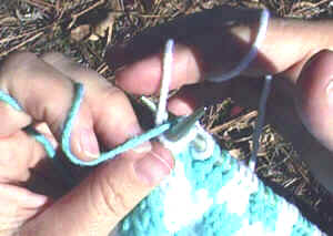 Catching a float of the right yarn is a little trickier. I do it by using any available finger on my left hand to pull the right yarn forward and down, while I knit the left yarn over the top of it. Short explanation--reach over the right yarn to knit the left yarn. In thte photo I'm pulling the white yarn forward and to the left and knitting the blue yarn over it.