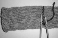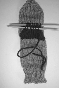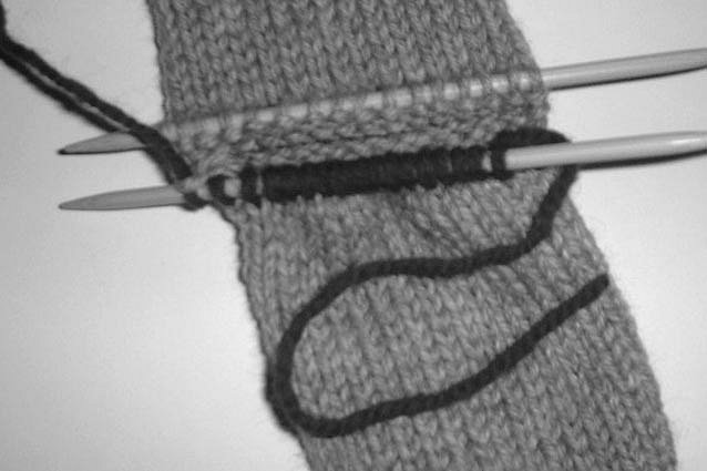STEP 8: You are now knitting on the LEG of your sock, with Main Yarn. Knit until the sock leg is 1 ½” to 2” shorter than desired length. When you get to that point, switch to working your desired ribbing (sample sock used K2 P2 ribbing). Work ribbing for 1 ½” to 2”, and then bind off LOOSELY, or you won’t be able to pull your sock on! You can even use a needle one or two sizes larger than you’ve been knitting with to help make the bind off looser.