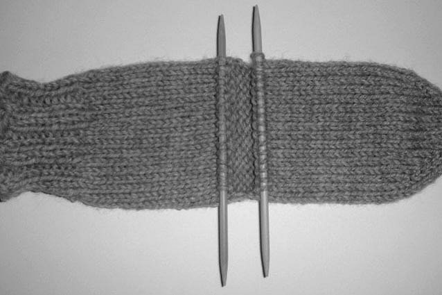 STEP 4: Flip sock. Knit ½ of stitches from first needle. Your stitches are now divided on 3 needles. Mark this as beginning of round.