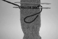 STEP 7: Your heel is worked on ½ the total number of stitches, in this case, half of 32, or 16. On the round that you are placing your scrap yarn, knit the stitches on needle 1. Drop Main Yarn. With scrap yarn, knit across needle 2. Tuck ends of scrap yarn into your sock to keep them out of the way. Go back to the beginning of needle 2 and pick up your main yarn, and knit across needle 2 a second time. The scrap yarn is where you will pick up the stitches for your heel. Finish round with Main Yarn.