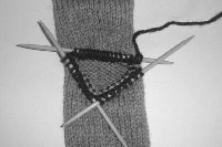 double point needle, K to last 3 stitches, K2tog, K1. With another double point,